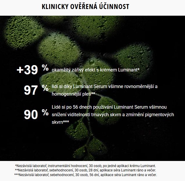 Začněte aplikací LUMINANT Seru, poté pokračujte s LUMINANT krémem – vytvoříte tak kosmetický rituál, který pomáhá redukovat viditelnost pigmentových skvrn a rozjasnit pleť.