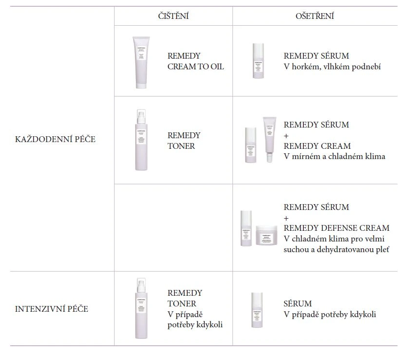 | SLOŽENÍ REMEDY cream: | Voda, Glycerin, Cetearyl isononanoát, Oleyl erukat, Behenylalkohol, Kaprylový/kaprický triglycerid, Cetearyl olivát, Butylenglykol, Propandiol, Sorbitan olivát, Coco-caprylate, Olej ze semen maruly, Alfa-glukan oligosacharid, Extrakt z Mirabilis jalapa, Mikrokrystalická celulóza, 1,2-Hexandiol, Cetearylalkohol, Cetearylglukosid, Máslo karité, Xanthanová guma, Sodná sůl levulinátu, Sodná sůl anisové kyseliny, Celulózová guma, Tokoferol, Extrakt z kůry magnolie, Hydroxid sodný, Disodná sůl EDTA, Kaprylhydroxamová kyselina, O-cymen-5-ol |