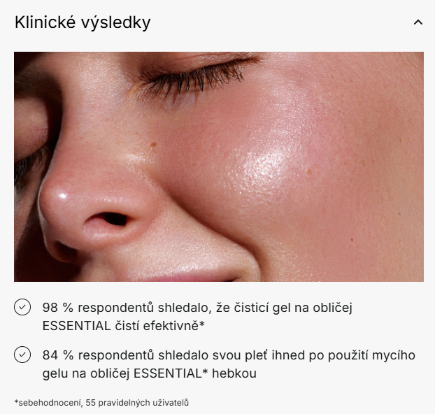 ESSENTIAL FACE WASH* s krémovou texturou, obohacený o přírodní osmolyt, obalí pleť jemnou pěnou, která účinně čistí a odstraňuje make-up.