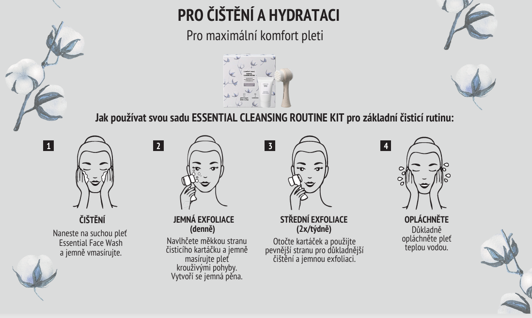 Jemné, ale důkladné čištění je základem krásné a vyvážené pleti. ESSENTIAL Cleansing Routine Kit je ideální volbou pro ženy od 30 let, které chtějí jednoduchou, ale účinnou každodenní rutinu bez podráždění a pocitu pnutí. Tato sada spojuje krémový čisticí gel s inovativním čisticím štětcem a proměňuje běžné čištění v příjemný pečující rituál – i po náročném dni v kanceláři nebo ve městě.