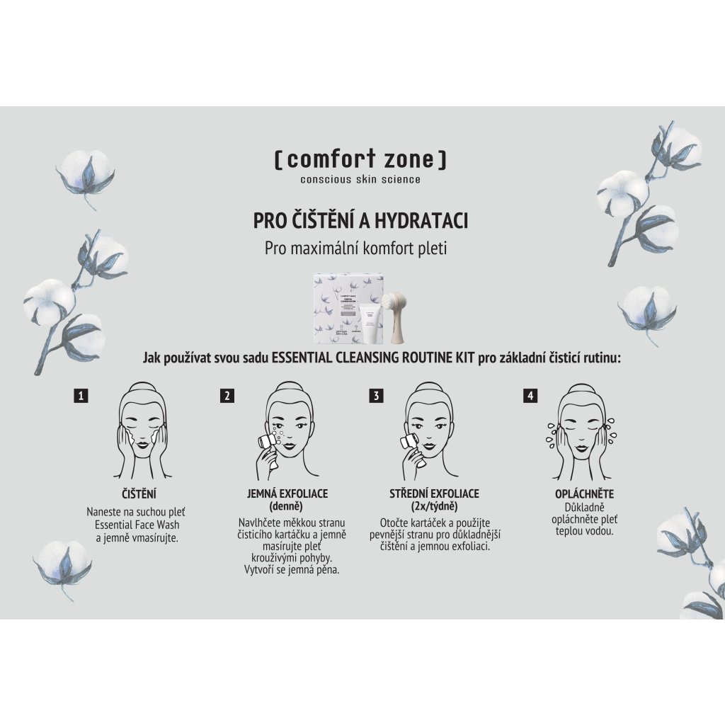 Jemné, ale důkladné čištění je základem krásné a vyvážené pleti. ESSENTIAL Cleansing Routine Kit je ideální volbou pro ženy od 30 let, které chtějí jednoduchou, ale účinnou každodenní rutinu bez podráždění a pocitu pnutí. Tato sada spojuje krémový čisticí gel s inovativním čisticím štětcem a proměňuje běžné čištění v příjemný pečující rituál – i po náročném dni v kanceláři nebo ve městě.