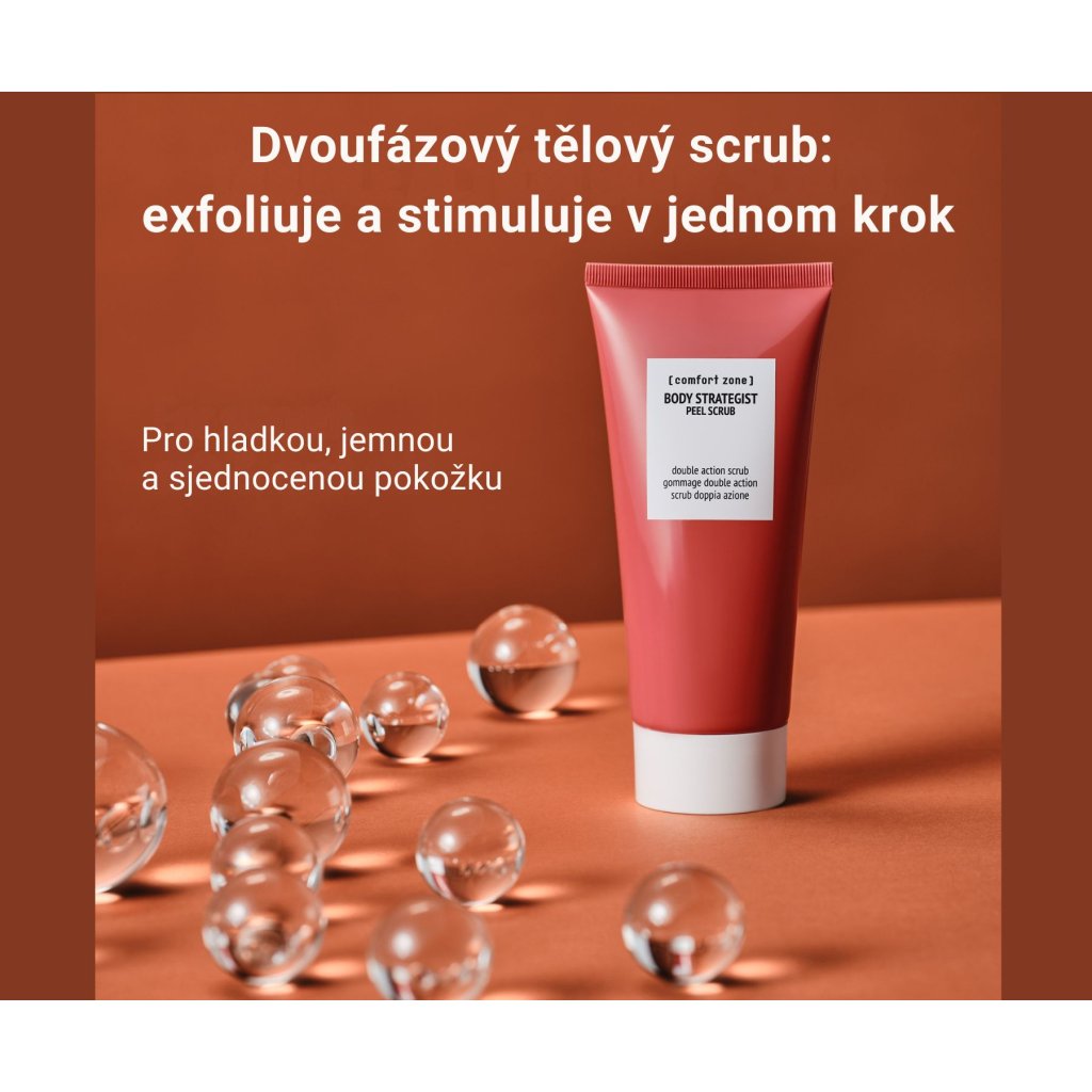 BODY STRATEGIST tělový scrub cestovní balení 50 ml Odstraněním odumřelých buněk z povrchu pokožky, podporuje hydrataci a okysličení. Získáte hedvábně jemnou, obnovenou a maximálně připravenou pokožku,