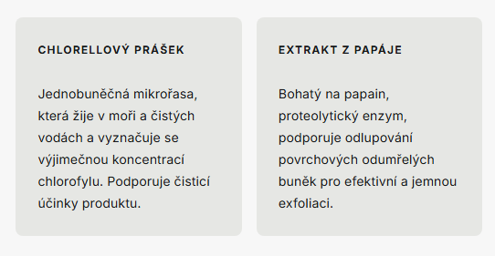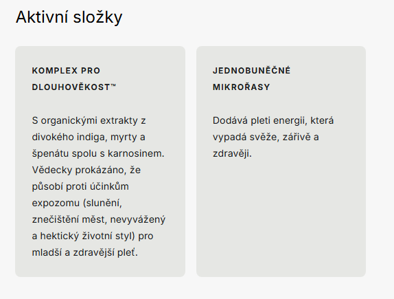 | SLOŽENÍ: | VODA*, BUTYLENGLYKOL*, EXTRAKT Z EUGLÉNY GRACILIS*, PENTYLENGLYKOL*, PROPYLENGLYKOL*, GLYCERIN*, XYLITOL*, BETAIN*, LAKTÁT SODNÝ*, PCA SODNÝ*, POLYGLYCERYL-10 LAURÁT*, GLYCIN, KARAGEENAN*, KOPOLYMER AKRYLOYLDIMETHYLTAURÁTU AMONNÉHO/VP, PROPANEDIOL*, CHLORFENESIN, KARNOSIN, EXTRAKT Z LISTŮ ŠPENÁTU OLEŘACEA / EXTRAKT Z LISTŮ ŠPENÁTU OLEŘACEA (SPINACIA OLERACEA)*, EXTRAKT Z MYRTY OBECNÉ*, OLEJ Z JALOVCE VIRGINSKÉHO*, KYSELINA CITRONOVÁ*, FYTÁT SODNÝ*, EXTRAKT ZE SEMEN TEPHROSIE PURPUREA*, PLODY JALOVCE OBECNÉHO OLEJ*, BENZOÁT SODNÝ, SORBAN DRASELNÝ, GLUKÓZA*, FRUKTÓZA*, NIACINAMID, MOČOVINA, OLEJ ZE SEMEN KORIANDROVÉHO / OLEJ ZE SEMEN KORIANDROVÉHO (CORIANDRUM SATIVUM)*, LINALOOL*, INOSITOL, LIMONEN*, OLEJ Z KŮRY CEDRUS ATLANTICKÉHO*, OLEJ Z PELARGONIUM GRAVEOLENS*, TOKOFEROL*, EXTRAKT ZE SEMEN ELETTARIE CARDAMOMUM*, EXTRAKT Z KVĚTŮ JASMINUM GRANDIFLORUM / EXTRAKT Z KVĚTŮ JASMINUM GRANDIFLORUM (JASMÍN)*. |