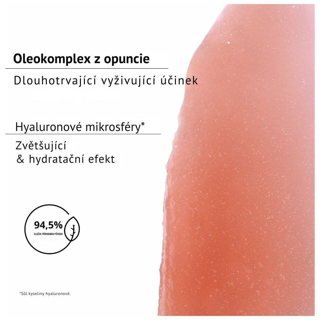 | SLOŽENÍ balzám: | Kaprylový/kaprický triglycerid, Dimer dilinoleyl dimer dilinoleát, Polyglyceryl-2 isostearát/dimer dilinoleát kopolymer, Olej z semínek Limnanthes alba (meadowfoam), Trihydroxystearin, Glyceryl behenát/eikosadionát, Ethylhexyl palmitát, Olej z jader meruňky, Olej ze semen švestky, Olej z řepky olejné, Aroma, Extrakt z květů opuncie, Olej z semínek Camelina sativa, Oxid titaničitý, Mica, Oxidy železa, Sodná sůl kyseliny hyaluronové, Oxid cínatý, Glucomannan, Linalyl acetát, Dimethyl fenetyl acetát |