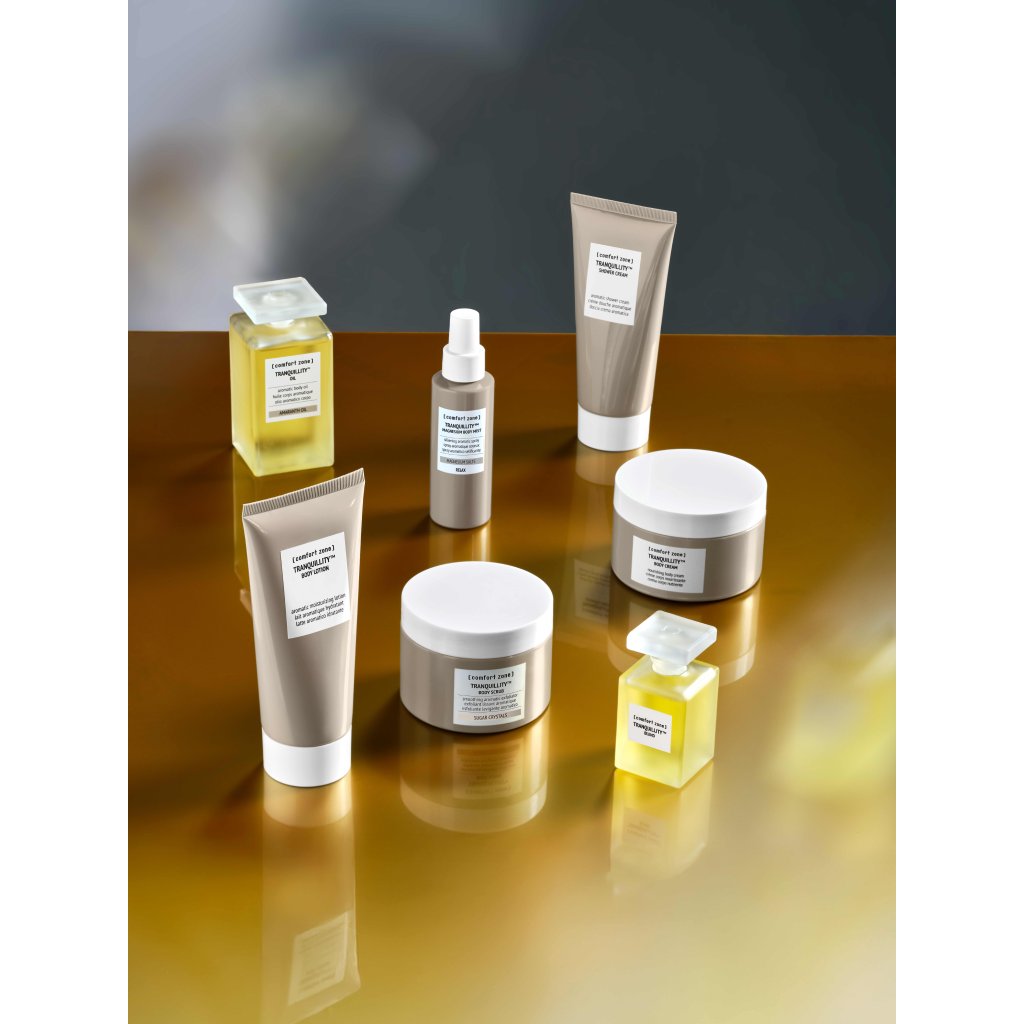 Aromaterapeutická vůně Tranquillity: pomeranč, damašská růže a cedr pro harmonii těla i mysli.